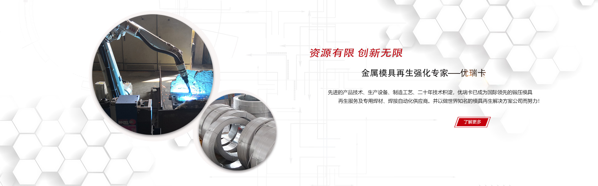 優(yōu)瑞卡是國(guó)內(nèi)知名的鍛造模具再生服務(wù)及專用焊材、模具焊接系統(tǒng)供應(yīng)商,我們吸收引用美國(guó)、德國(guó)、日本等國(guó)的先進(jìn)模具焊修經(jīng)驗(yàn),結(jié)合國(guó)內(nèi)企業(yè)情況,不斷創(chuàng)新并研發(fā)了更加有效、更加成熟、更易操作的模具再生技術(shù),為廣大企業(yè)在鍛造、沖壓、壓鑄、塑料模具及機(jī)械部件維修方面提供優(yōu)質(zhì)的焊接材料、自動(dòng)化焊接系統(tǒng)、模具加工用刀具和完善的再生修復(fù)服務(wù)。優(yōu)瑞卡正逐漸成為國(guó)內(nèi)外鍛造與沖壓企業(yè)創(chuàng)造更大利潤(rùn)、提升核心競(jìng)爭(zhēng)力不可或缺的重要推動(dòng)力!